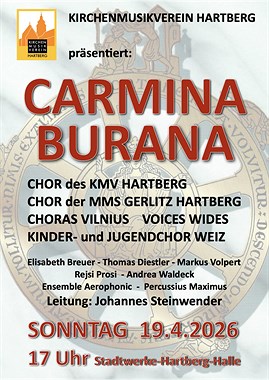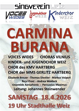 Kontakt Am Chorgesang interessierte Jugendliche im Alter zwischen 14 und 25 Jahren die beim "Jugendchor Weiz" mitsingen möchten, können sich telefonisch unter folgender Mobilnummer (0660/77 07 974) oder per Mail mit dem Chorleiter in Verbindung setzen. Tel: 0660 / 77 07 974Mail: hst@jugendchorweiz.at CARMINA BURANA 18.04. CARMINA BURANA 19.04.