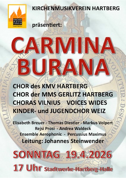 Gemeinsam mit dem Staatschor Vilnius, dem Chor des KMV Hartberg, dem Chor der 2aM der MMS Gerlitz, den fantastischen Solisten Elisabeth Breuer (Sopran), Thomas Diestler (Countertenor), Markus Volpert (Bariton), den Pianistinnen Rejsi Prosi und Andrea Waldeck, dem Ensemble Aerophonic und Percussius Maximus werden alle Chöre vom Singverein Weiz unter der Leitung von Johannes Steinwender die Stadtwerke- Halle Hartberg zum Beben bringen. An die 200 Mitwirkende werden für Gänsehautmomente sorgen.